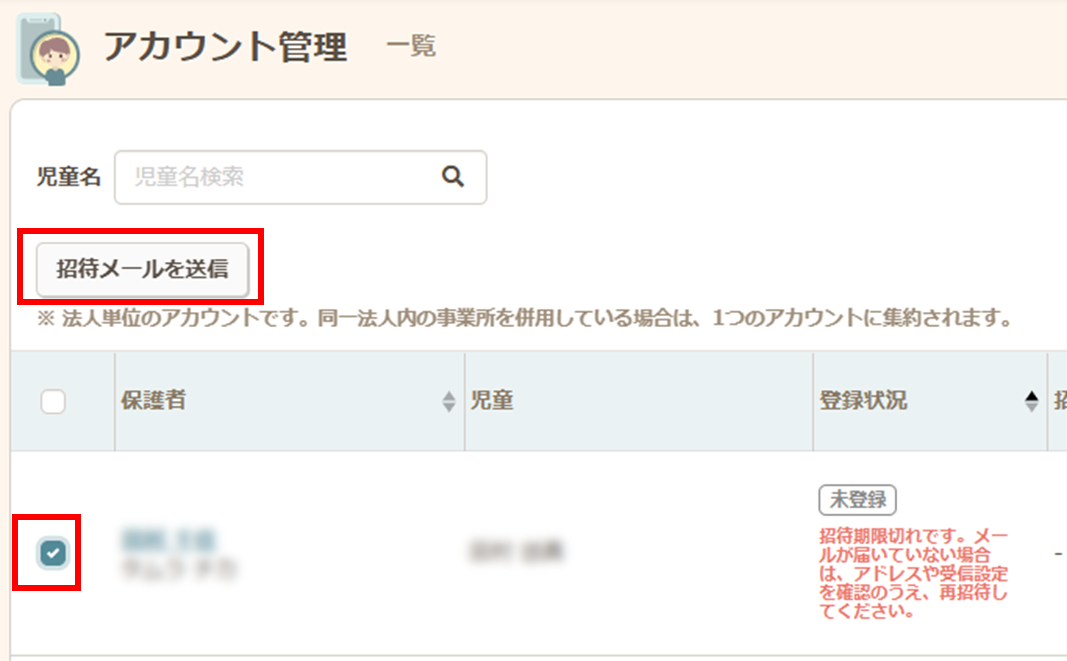 招待メールを送付したい保護者のチェックボックスにチェックを入れ【招待メールを送信】ボタンをクリックします。