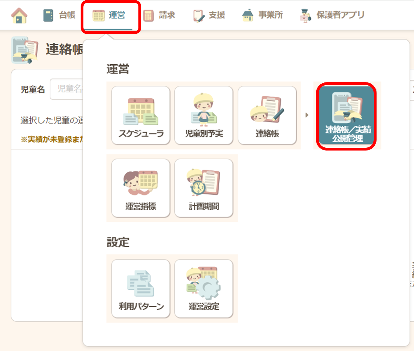 - グローバルナビの【運営】から【連絡帳・実績公開管理】をクリックします。