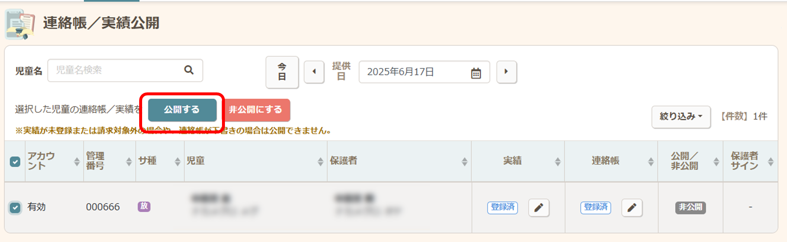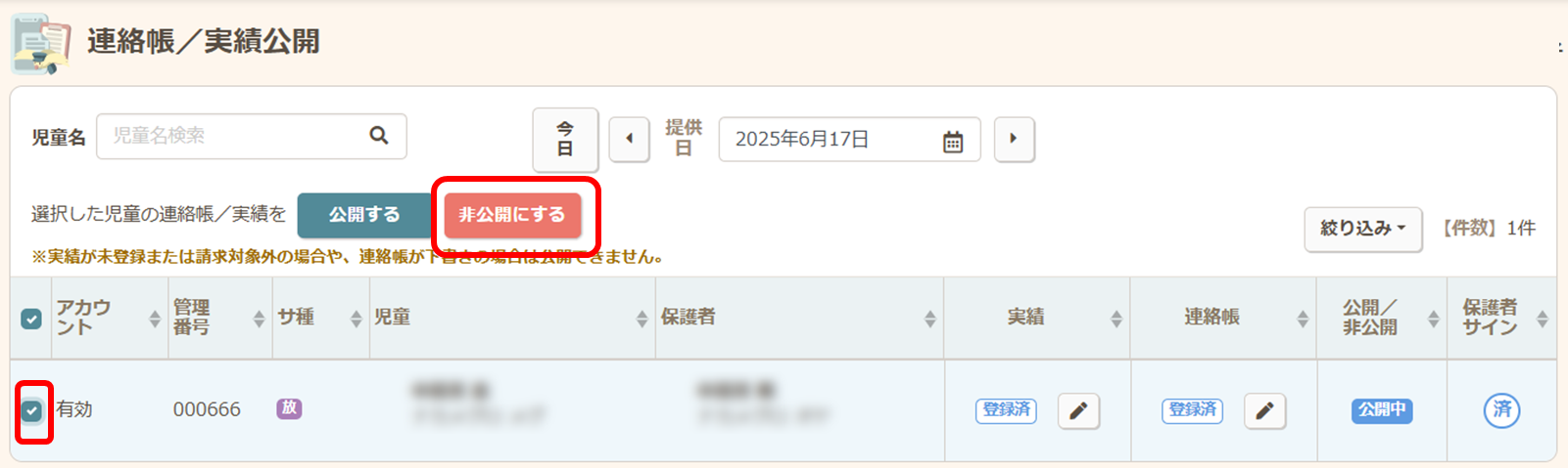 - 実績を編集したい児童のチェックボックスにチェックを入れて、【非公開にする】をクリックします。