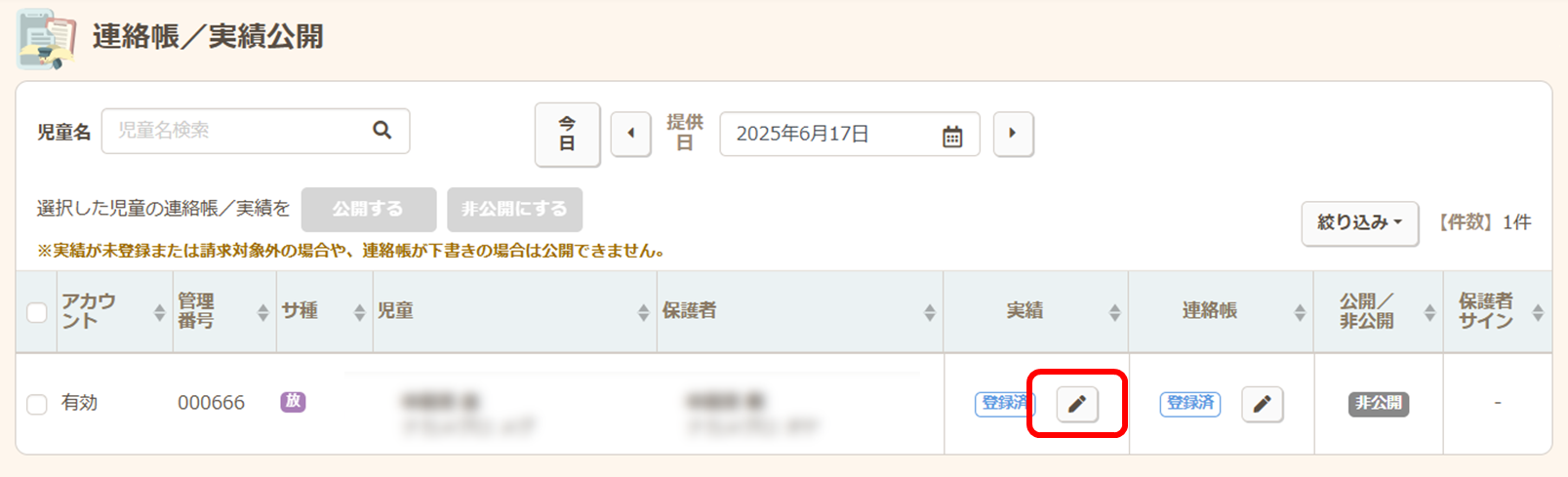 A:連絡帳・実績を登録し保護者へ公開した後は実績の編集は出来ず、「記録の更新」ボタンしか表示されません。再度実績を編集する場合は、保護者への連絡帳・実績を非公開にすることで実績の編集を行うことができます。