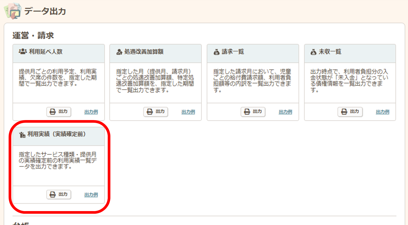 「利用実績(実績確定前)」の【出力】のボタンをクリックします。