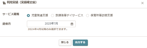 サービス種類、提供月を選択して、出力してください。