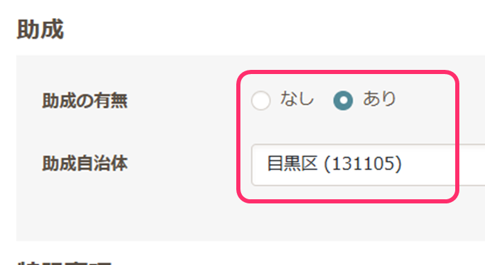 - 助成:助成の有無 あり(受給者証発行の市区町村を選択します)