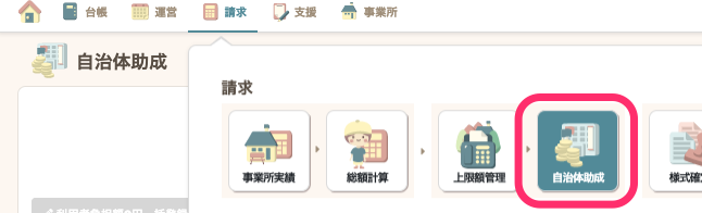 - グローバルナビの【請求】から【自治体助成】をクリックします。