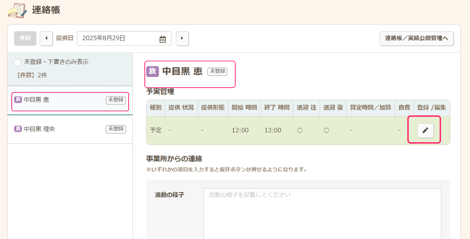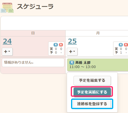 なお、実績は【運営】の【スケジューラー】、または【運営】の【児童別予実】からも登録可能です。連絡帳は【運営】の【スケジューラー】、または【運営】の【児童別予実】からも登録可能です。