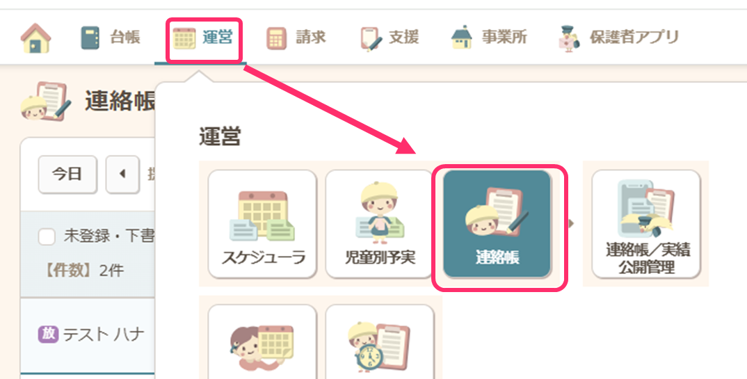 - グローバルナビの【運営】から【連絡帳】をクリックします。