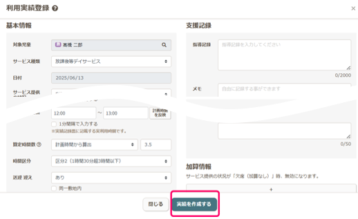 なお、利用予定にはない実績を作成したい場合は、スケジューラーから登録してください。参照:実績を新規登録する - 「利用実績登録」のページに移行しますので、実績を作成してください。