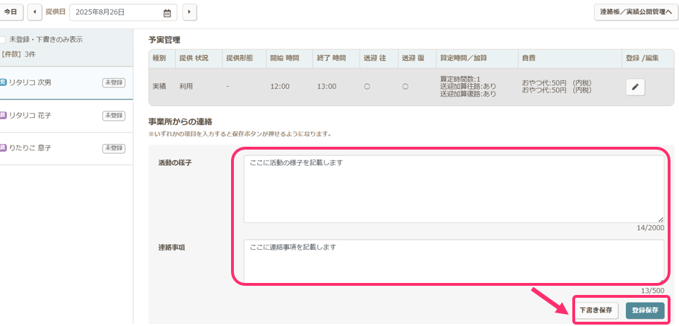 ※【運営】の【児童別予実】または【スケジューラー】からの登録と同じページが表示されます。 - 【実績を作成する】をクリックすると、再び「連絡帳」のページに戻ります。必要に応じて「活動の様子」や「連絡事項」を登録し、【下書き保存】または【登録保存】をクリックします。