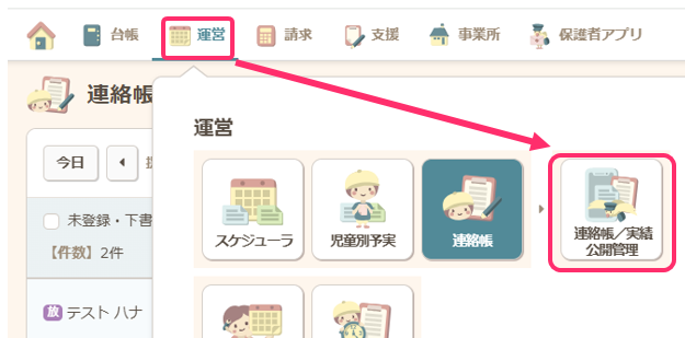 - グローバルナビの【運営】から【連絡帳/実績公開管理】をクリックします。