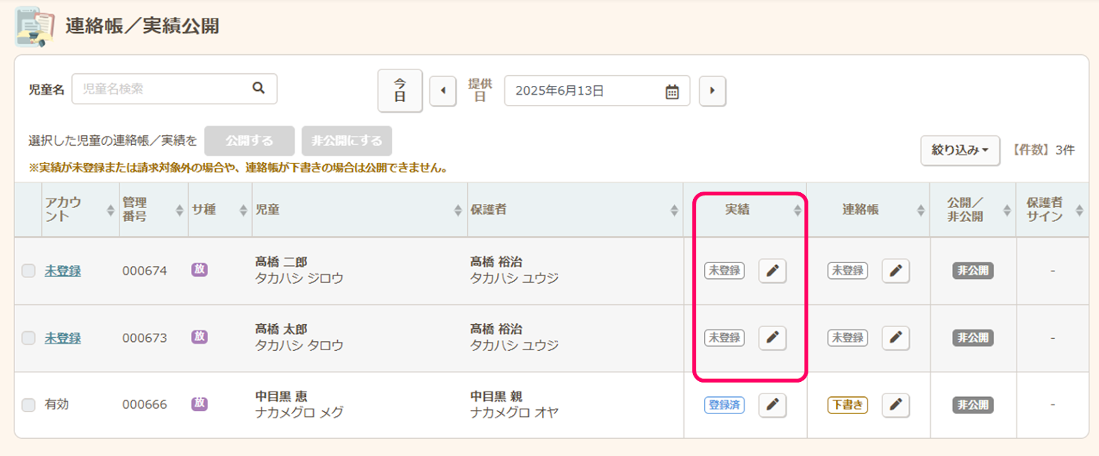公開対象者の連絡帳/実績を公開します。連絡帳/実績の公開管理についての詳細な操作方法はこちらを参照願います。連絡帳を公開する