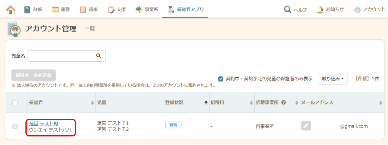 アカウント再発行したい保護者名をクリックします。