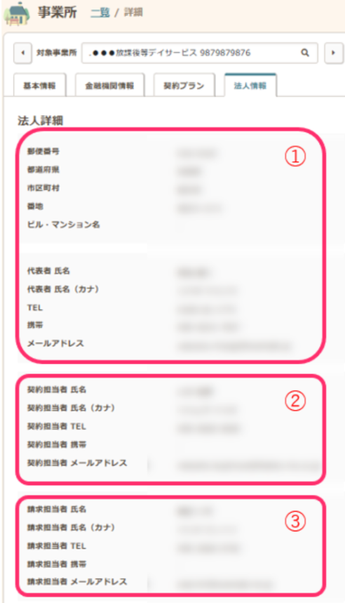 - 運営支援システムをご契約いただいている法人情報は、運営支援システム上で確認することができます。