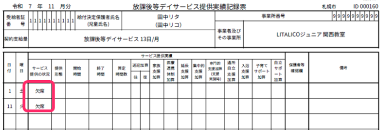 実績記録表に欠席として記載される