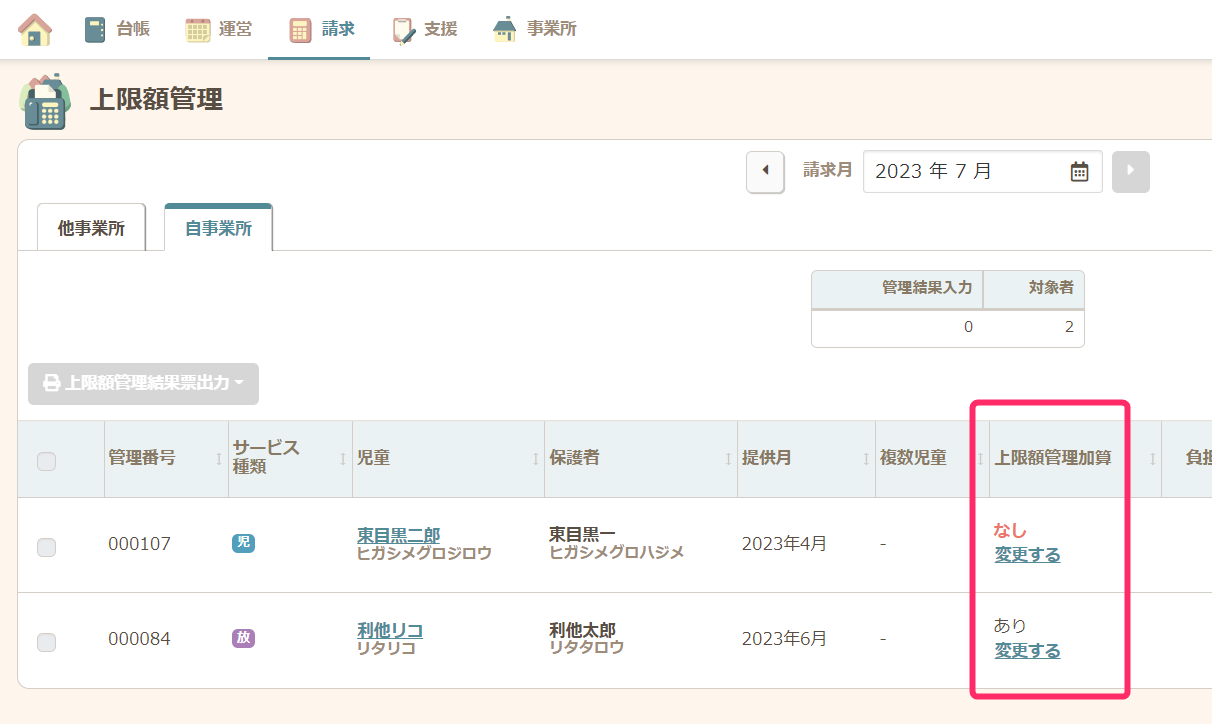 - 【請求】の【上限額管理】で自事業所タブより、上限額管理加算が正しくなっていることを確認します。