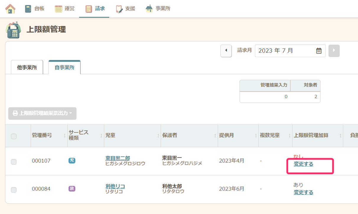 - 間違っている場合、上限額管理加算「あり」または「なし」の下の「変更する」をクリックします。こちらのリンクから【運営】の【児童別予実】に移動します。