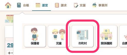 - グローバルナビの【台帳】から【市町村】をクリックします。