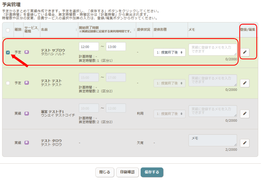 - 左のチェックボックスを選択して、時間やメモなどを記載の上【保存する】をクリックすると、まとめて実績登録ができます。