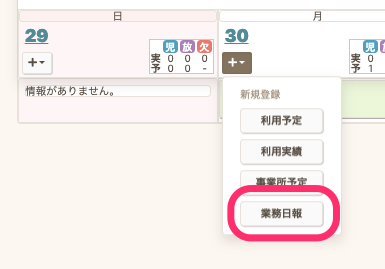 - 日付の下の【+】ボタンをクリックし、【業務日報】を選択します。