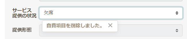 自費サービスは、サービスの利用を「欠席」「加算のみ」「欠席(加算なし)」を選択すると自動で削除されます。サービスの利用がない日に自費サービスを追加したい場合は、削除された後に改めて自費項目を選択して追加してください。