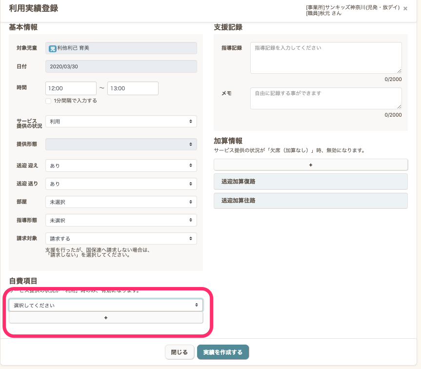 - 自費項目の選択肢として、台帳で登録した自費サービスが一覧になり、選択できるようになります。