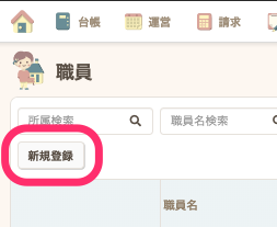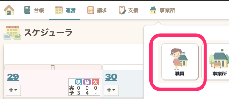 - グローバルナビの【事業所】から【職員】をクリックします。
