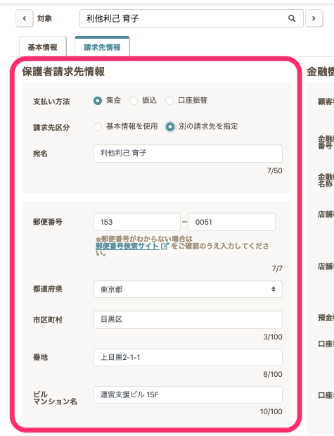 - 請求先情報を登録したい保護者の名前を選択します。