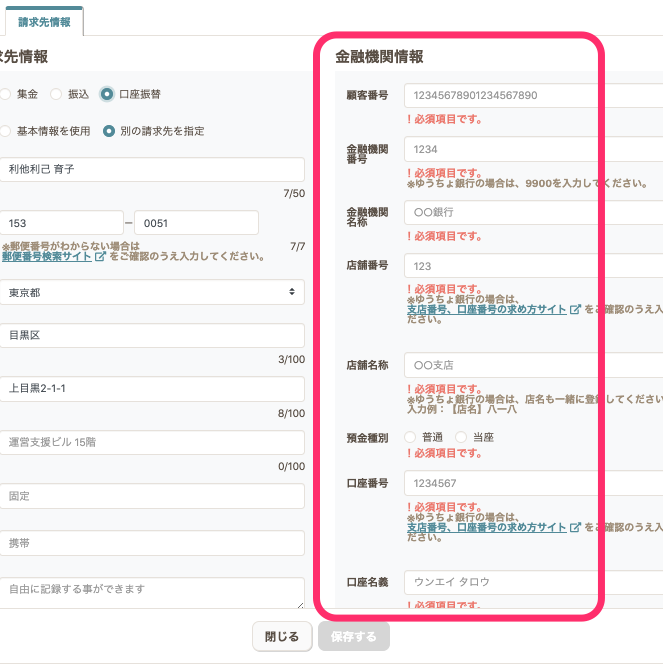 - 支払い方法が【口座振替】の場合、口座振替に登録している金融機関情報を入力します。