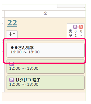 事業所の予定を登録する 目次 使用する場面 ・スケジューラで事業所の予定管理をする 事業所の予定を登録する グローバルナビの【運営】から【スケジューラ】をクリックします。 日付下の【+】ボタンをクリックし、事業所予定を選択します。 タイトル・時間等を記入し、【新規登録する】をクリックします登録すると、スケジューラーに下記のように反映されます。