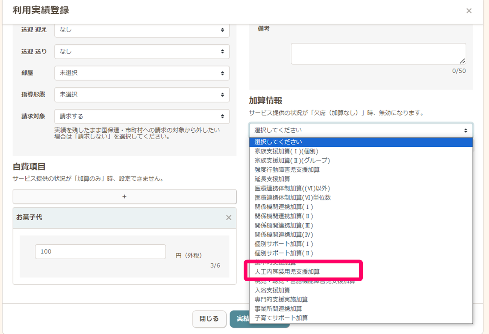 ※加算種別は「人工内耳装用児支援加算Ⅱ」ですが、運営支援システムの加算の選択肢上では「人工内耳装用児支援加算」と表示されます。