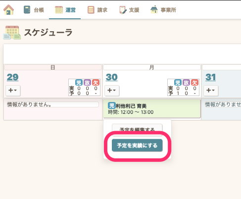 - グローバルナビの【運営】から、【スケジューラ】をクリックし、該当実績の編集画面を開きます。(【運営】の【児童別予実】からも同ページにアクセスできます。)