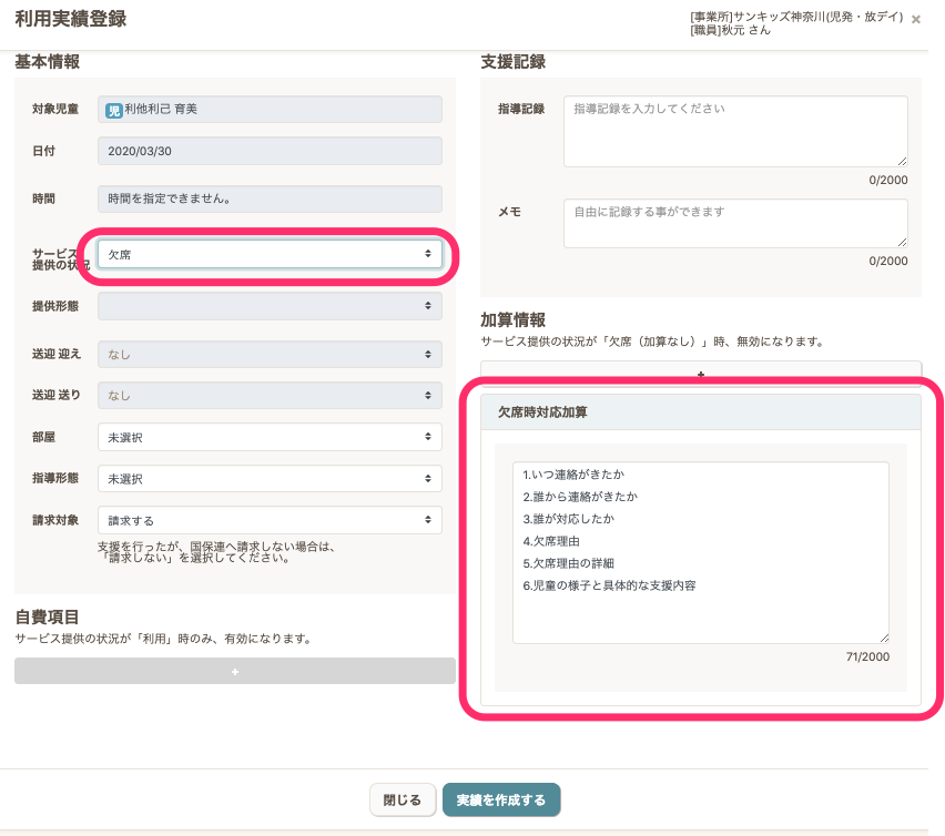 - サービス提供の状況を「欠席」を選択します。記録すべき項目について必要に応じて運営支援上で記録します。