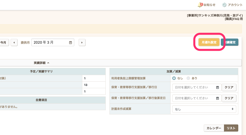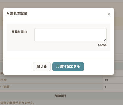 - 画面右上の【月遅れ設定】をクリックし 、理由を入力し「月遅れ設定する」をクリックします。