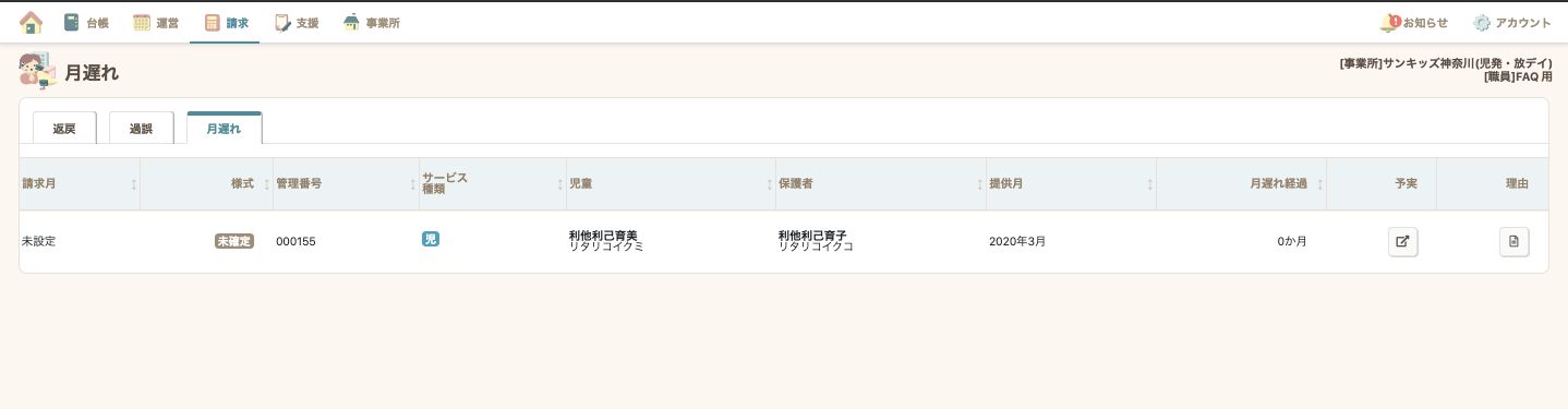 - グローバルナビの【請求】から 【月遅れ】を選択すると、設定した児童が一覧に表示されるようになります。