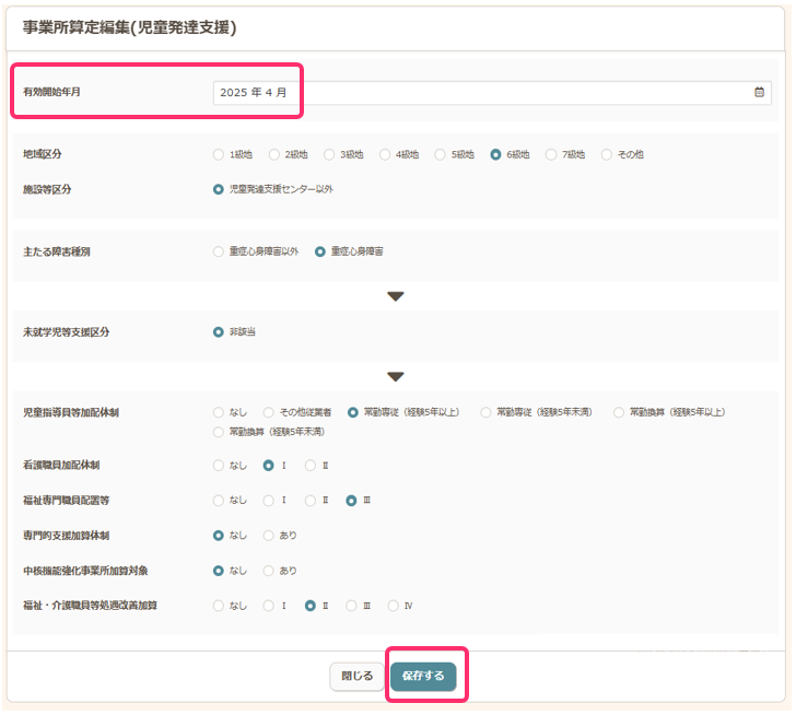 - 有効開始年月を選択すると、画面に項目が表示されます。(下の例は2025年4月利用分からの算定です)