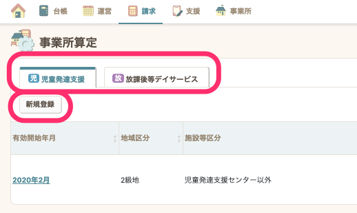 - 登録するサービス種類のタブを選択し、 画面左の【新規登録】をクリックします。