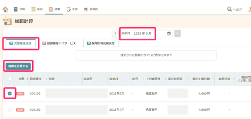 - 請求する月・利用サービスを確認し、総額計算したい児童にチェックを入れ【総額計算する】をクリックします。