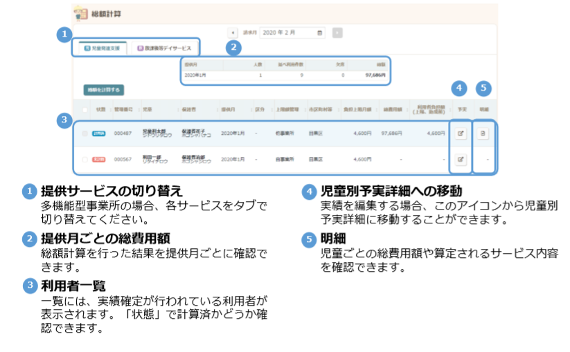 ・総額計算すると、各児童・提供月ごとの総費用額や算定されるサービス内容が確認できるようになります。