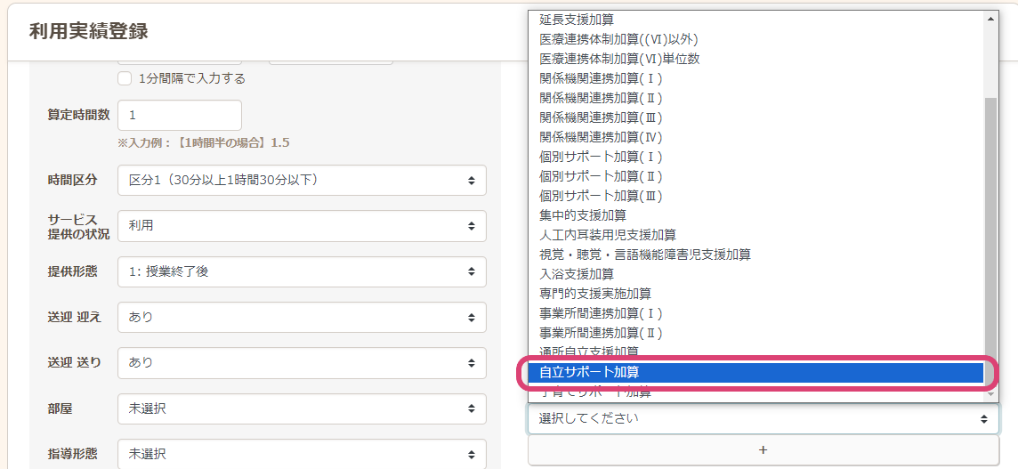 加算情報の下の+ボタンをクリックし、「自立サポート加算」を選択します。