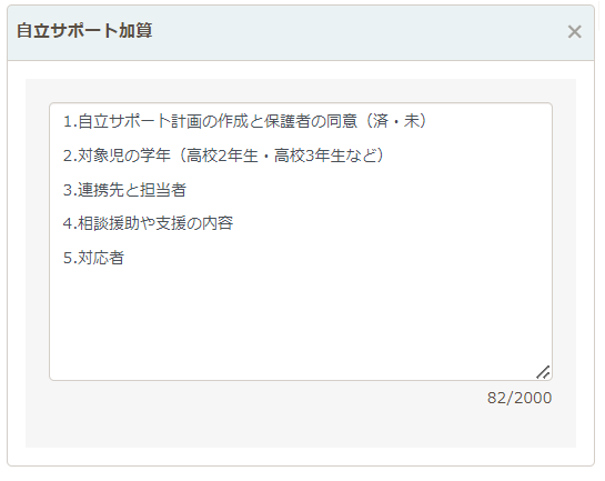 加算を選択すると記録用フォーマットが表示されますので、必要に応じて記載し保存します。(記載は任意です)なお記録した内容は、支援経過で確認及び印刷することができます。詳しくはこちらを参照願います。支援経過を確認する