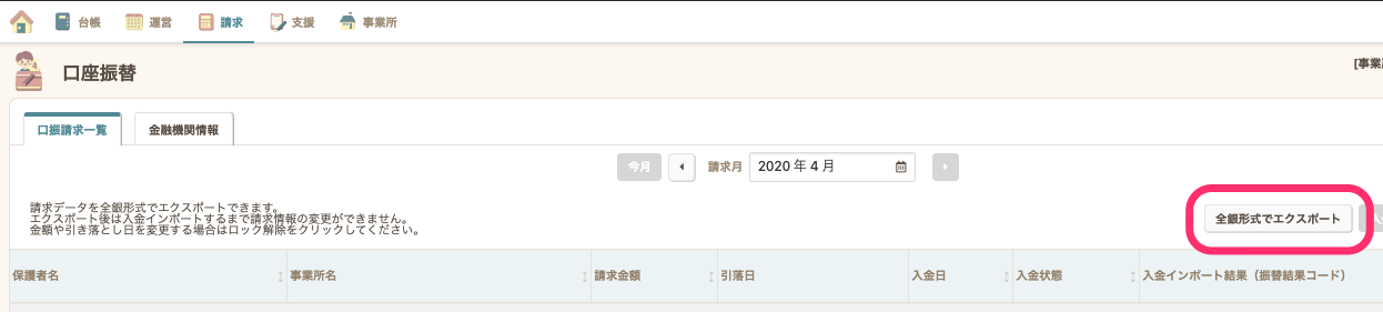 - 口振請求一覧に、全事業所の請求が表示されている事を確認し【全銀データ形式でエクスポート】ボタンをクリックします。