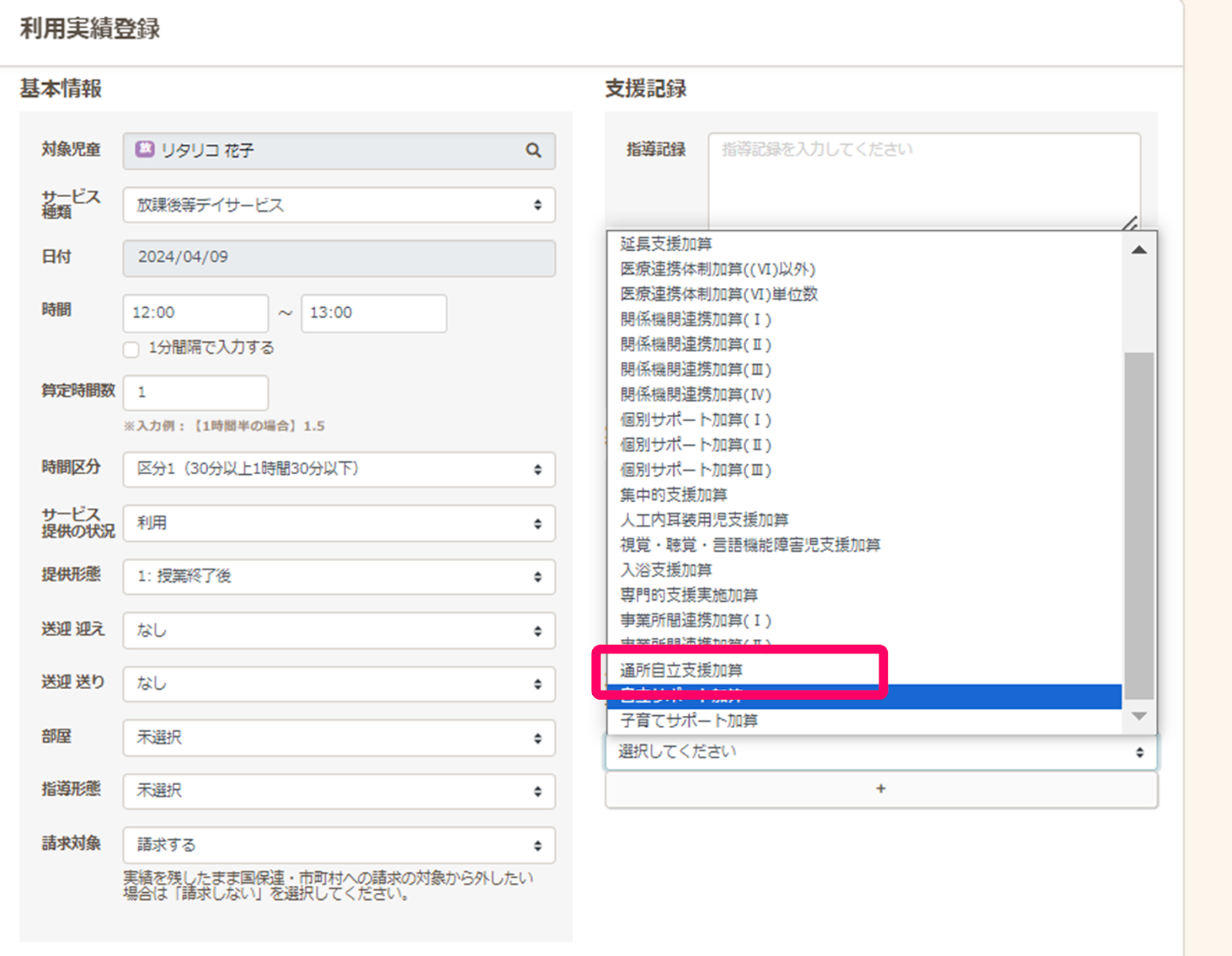 加算情報の下の+ボタンをクリックし、「通所自立支援加算」を選択します。