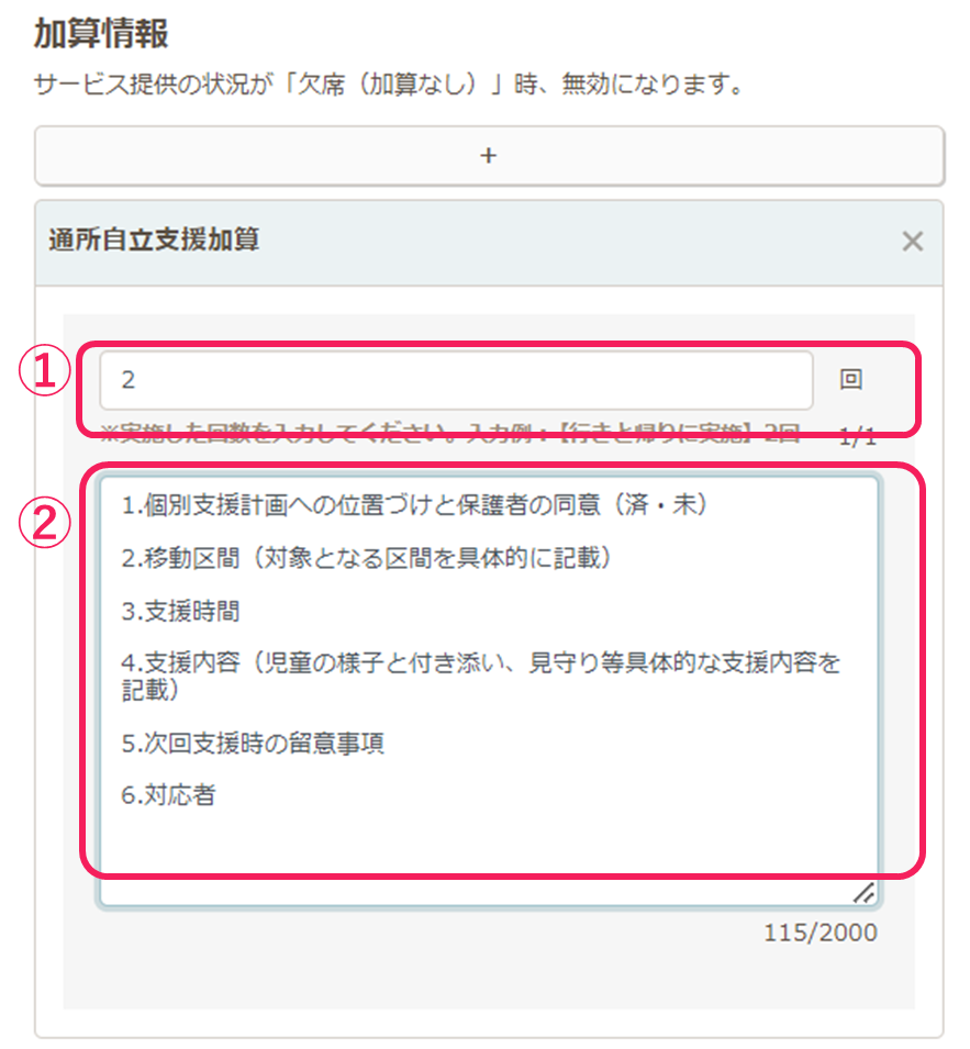 ①の回数は入力必須項目です。実績記録票にも反映されます。片道の場合は1回、往復の場合は2回と記入してください。