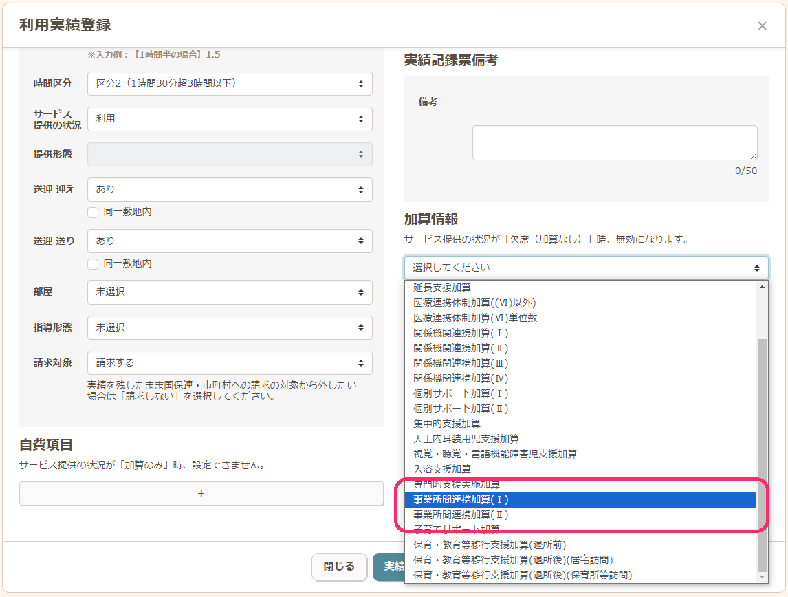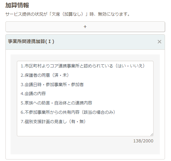 加算情報の下の+ボタンをクリックし、「事業所間連携加算加算」を追加し実績を作成します。