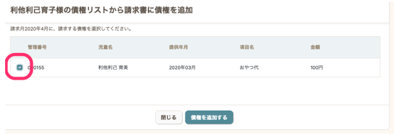 - 請求に追加する債権を選択し、【債権を追加する】ボタンをクリックします。請求に追加され、請求金額が再計算されます。