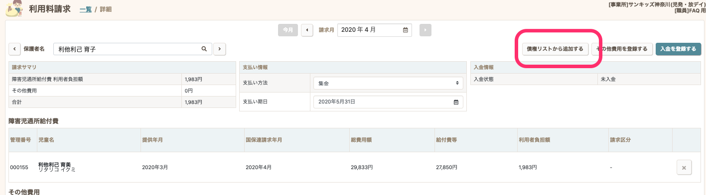 - 債権を請求する場合は、利用料請求時に債権リストから追加します。