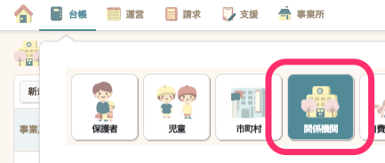 関係機関を登録する 目次 使用する場面 自事業所が上限額管理をしている場合の併給先の登録 他事業所が上限額管理をしている場合の上限額管理事業所の登録 保育所等訪問での訪問先の保育園・幼稚園・小学校等の登録 関係機関を登録する グローバルナビの【台帳】から 【関係機関】をクリックします。 画面左上の【新規登録】ボタンをクリックします。 事業所種別を選択します。「障害児支援」を 選択した場合に、事業所番号などの項目が表示されます。 必須項目を入力し、【新規登録する】を クリックします。