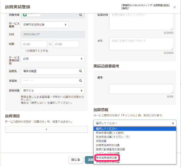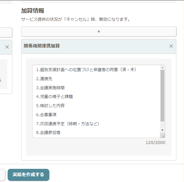 加算情報の下の+ボタンをクリックし、「関係機関連携加算」を選択します。