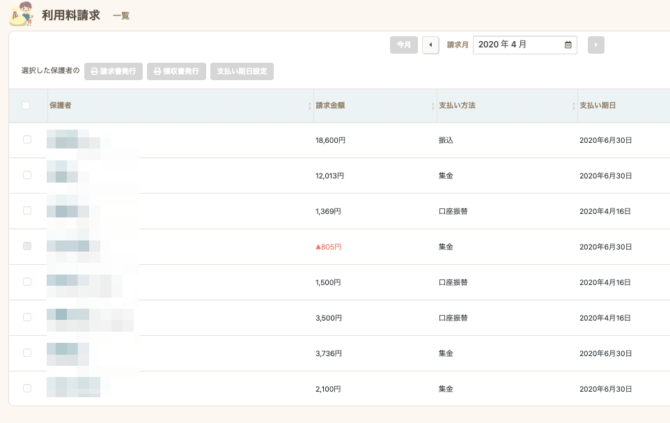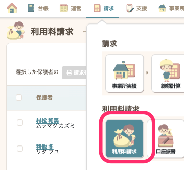 - 一覧から、確認したい保護者名をクリックすると利用料の確認ができます。