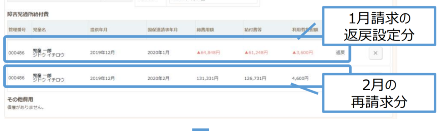 - 返戻や過誤設定を行うと、利用料請求にマイナスの明細が作成されます。