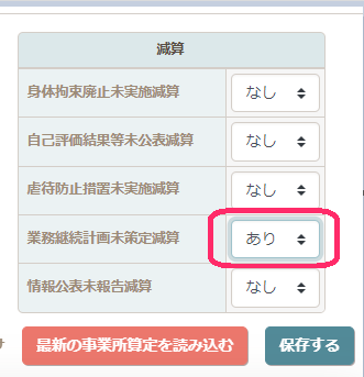 減算の枠の業務継続計画未策定減算で「あり」を選択し、ほか箇所に間違いがなければ【保存する】をクリックします。